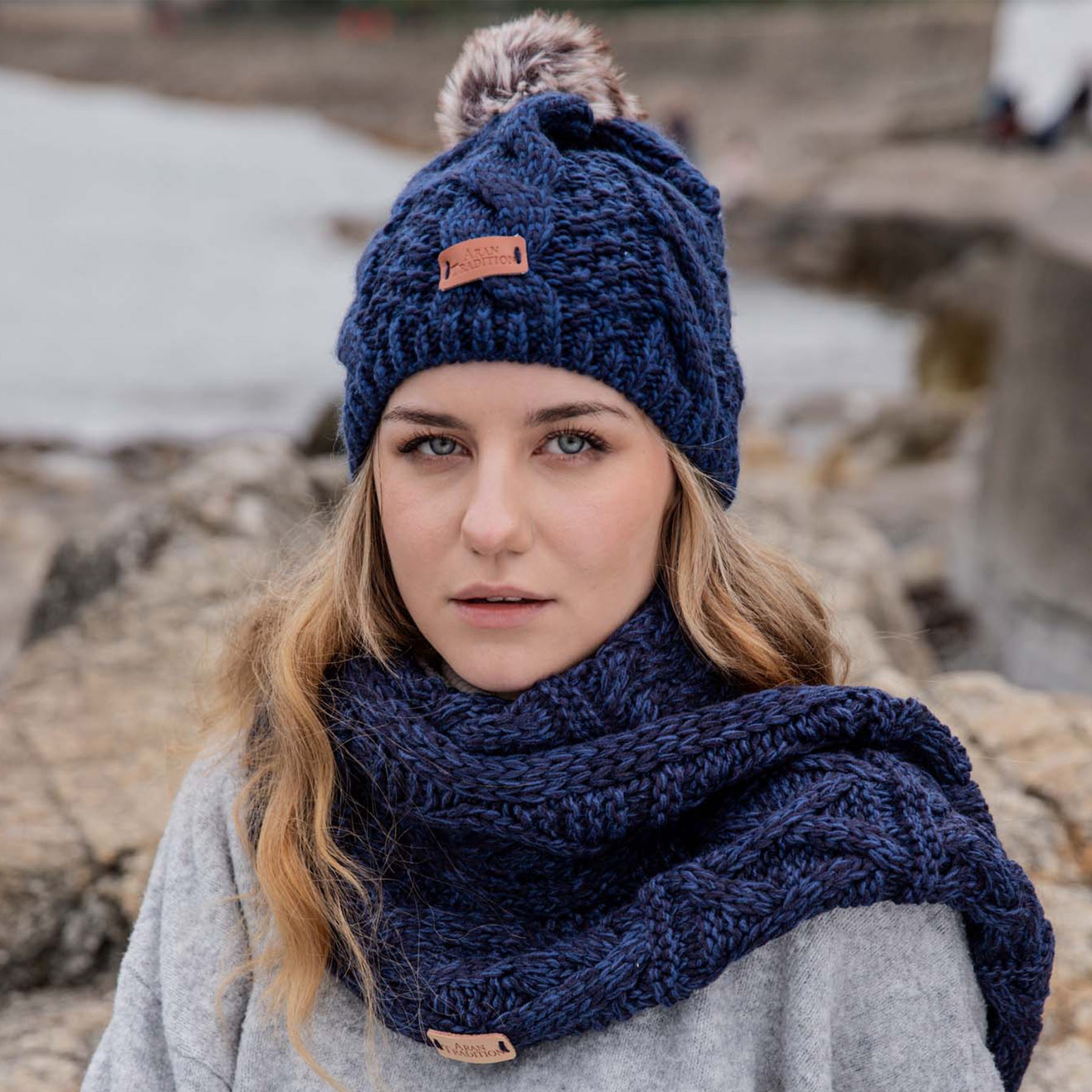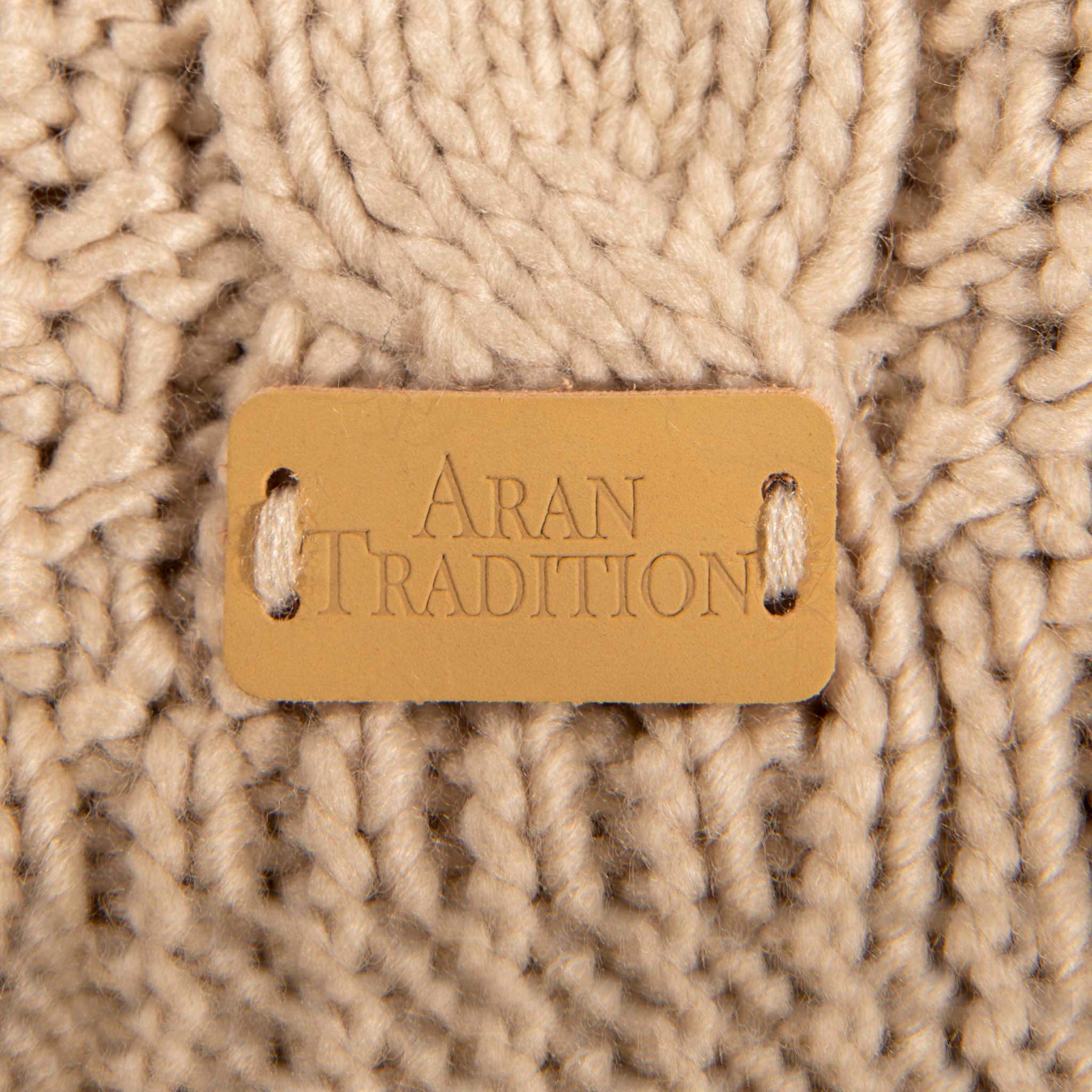 The rib hem ensures a comfortable and flexible fit, accommodating different head sizes. With the pale tan leather brand logo hand-stitched on the front hem rib, this hat showcases attention to detail and authenticity. Stay fashion-forward and cozy all winter long with this classic Aran cable tammy hat.