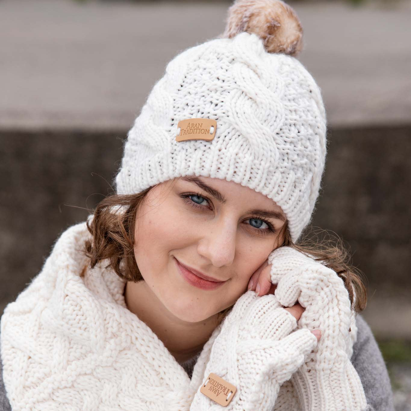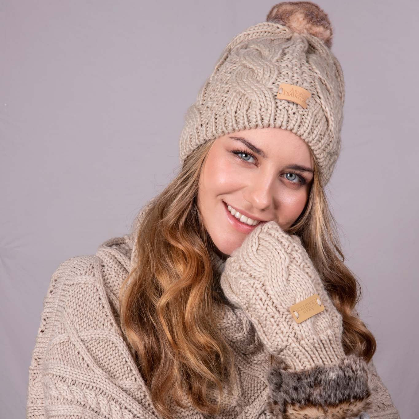 Elevate your winter style with our Aran Cable Tammy Hat from Aran Traditions. Crafted with a chunky cable knit pattern in a soft and cozy 3GG knit, this hat exudes warmth and sophistication. The natural-coloured faux fur pom pom adds a touch of elegance to the overall design.
