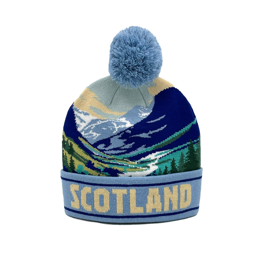 Made from 100% acrylic for a soft and snug fit, this stylish bobble hat features a light blue pom pom on top and a light blue knit body with a beautiful illustration of the Scottish Highlands, complete with the word ‘Scotland’ boldly displayed across the front.